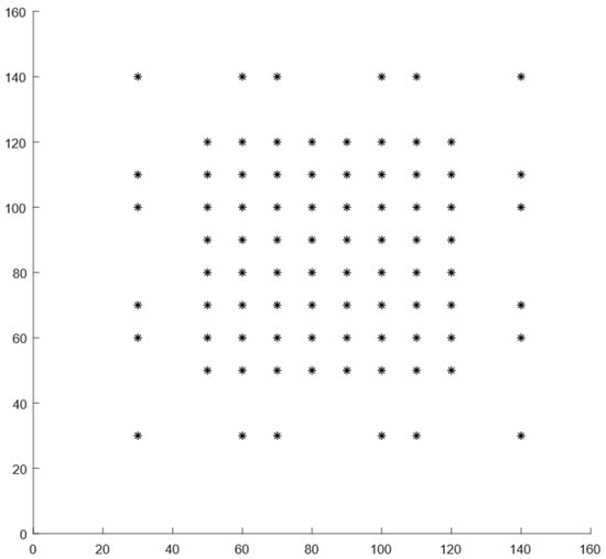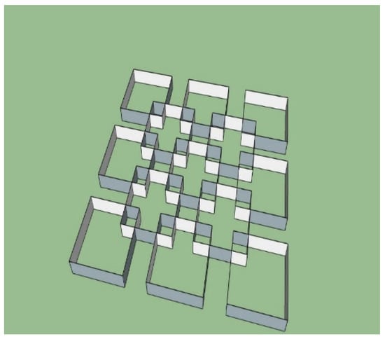 Convert the slicing model created in the previous section into computer-processed geometry (Figure 3) to use the partitioning algorithm in this section. The intersection of multiple line segments in the geometric figure is marked as a geometric point (Figure 4) and assigned numbers as ……. Then, each geometric point is assigned a Cartesian coordinate value as , …… according to the geometric data measured in the 3D concrete printing component model. For each line segment in the geometric figure, a matrix describes their length and the number of intersections, and the elements in the matrix as weights. In this paper, the number of elements in represents the intersection point of the nozzle running path, and the number of line segments in the geometric figure represents the connection path between these intersection points. Therefore, there is a linear relationship between the number of line segments in the geometric figure and the number of elements in , and the length of the line segments and the size of elements in are also linear.