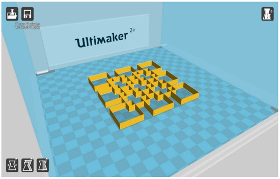 Export the model as an STL file after modeling. The STL file is imported into Cura for slicing operations, and the slicing model (Figure 2) is obtained. Cura is 3D printing software designed by Ultimaker. It was developed using Python and integrates the Cura Engine developed by C++ as the slicing engine. It is characterized by fast slicing speed, good user experience, and allows users to adjust the print quality and materials used. However, because Cura can only recognize model files in STL format, it is necessary to convert the built model into STL file format when using it.