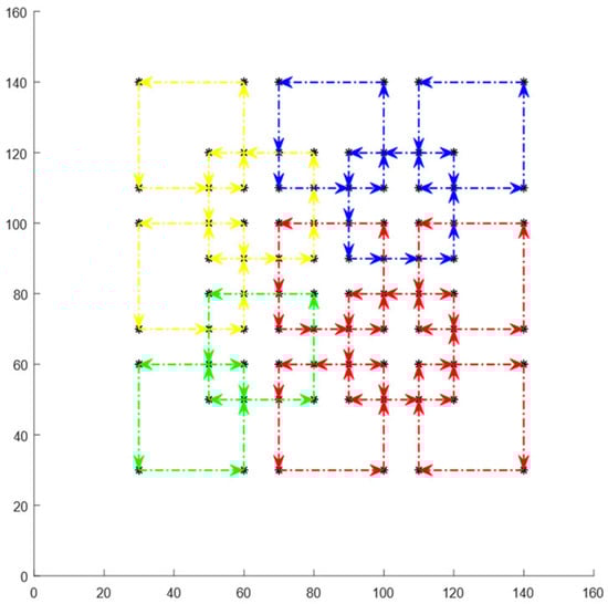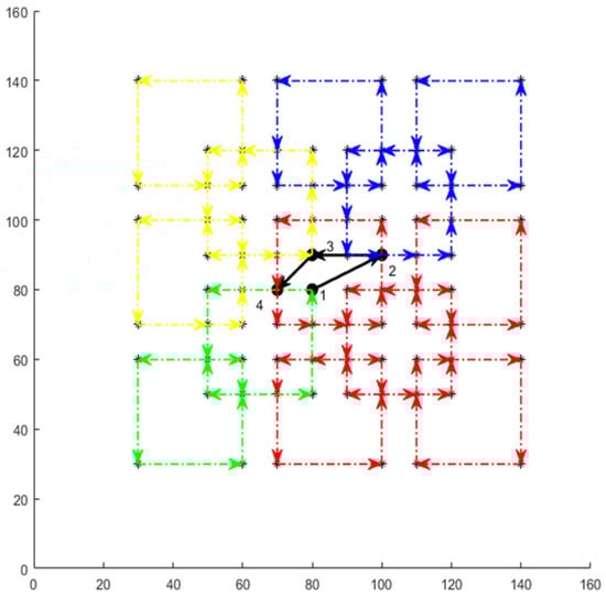 The geometry is divided into n areas after the partition is completed. Create n arrays to store the geometric points in each partition geometry; each array is denoted as . The geometric point in each array is denoted as , and mark its Cartesian seat as . Extract a geometric point from each array and apply the ant colony algorithm to get the shortest path between them. This process needs to be repeated several times until the geometric points in each array are traversed to find the final optimal path. However, such a process is complicated and time-consuming. Therefore, constraints are introduced in this paper (the constraints are as follows: Equations (1)–(3)). Use the ant colony algorithm to find the shortest path, as the judgment result is F = 1. On the contrary, discard the extracted geometry point combination if the judgment result is F = 0.