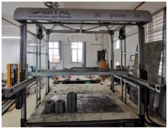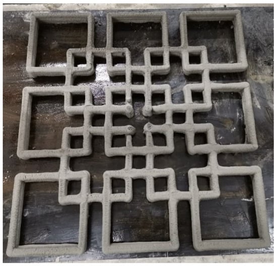 Three-dimensional concrete printing is a kind of additive manufacturing based on the digital model, with special “ink” made of cementitious materials, admixtures, additives, special fibers, and aggregates [1]. The printing process converts the architectural model into a three-dimensional design drawing with computer graphics, moves according to the set printing path, continuously extrudes the concrete slurry, and adds material layer by layer through layered processing and superposition molding to build the building [2]. The molding process is like fused deposition modelling (FDM), which is a linear lamination molding of the slurry extruded through the print head without the aid of a template [3].