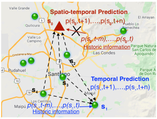 Let us denote by the PM pollution at site , with , where represents the vector of spatial coordinates, and time , with . While in the temporal prediction the main goal is to forecast the level of pollution in a given station for ahead time steps (), , considering the historical information of pollution in the same site , , the spatio-temporal prediction consists of predicting the pollutant concentration at new site where there are not monitoring stations—that is, the past information is not available, but the past information of the nearest stations is used. Such prediction can be extended to every point on a regular grid for producing a prediction map. Figure 1 shows an example of the difference between temporal and spatio-temporal predictions. Mathematically, the space-time prediction can be expressed as a nonlinear transformation of the past pollution observations at different sites using no linear functions. Hence, the proposed model can be written as