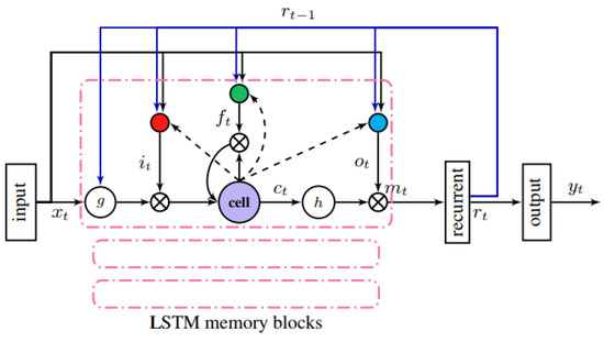 In Figure 2, we can see an operating scheme of the recurrent neural network LSTM. In a simplified way, an LSTM neural network assumes a multidimensional input that interacts with the previous network state , where it first passes through the input gate having as output, which enters the memory cell that is affected by the forget gate output given by in order to generate the memory cell output . This, in turn, is fed to the hidden state variable h, which passes by the output gate originating the output variable . Finally, the output in conjunction with the hidden state of the network h determines the current state of the network , which eventually can feed back the previous gates a predefined number of times. This recurrent network is based on sequential processing of information, where particularly long-term information can be controlled through the forgetting gate.