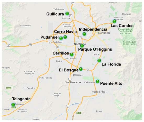 As the objective of our study focuses on the Metropolitan region, the information recorded from 2010 to 2018 by the meteorological stations located in the capital was used, which are: Cerrillos, Cerro Navia, El Bosque, Independencia, La Florida, Las Condes, Pudahuel, Puente Alto, Quilicura, Parque O’Higgins and Talagante. Figure 3 shows their geographical locations.