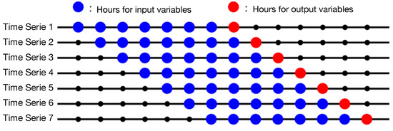 The time series used for the input and output of the neural network model were generated as follows: first, the entry and output periods were selected, corresponding to the first 24 h available and 25th hour, respectively. The variables to be considered for each hour were extracted and concatenated in an array. Then, the generation process started from the following hour, taking the interval 2–25 for the input period and the 26th hour for the output period. Again, the variables were extracted and a list was generated. This process was repeated, concatenating the arrays in a data matrix, which was used for both training and test data. This procedure is called sliding window [49] and can be seen in Figure 4. It should be noted that the data obtained in each hour correspond to those given by each station. To denote each station, its coordinates (latitude and longitude) were added.