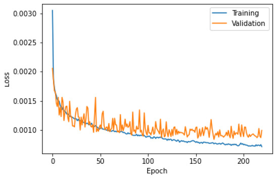 Finally, we fit the multilayer LSTM neural network according to the two experiments specified in Section 5 which consider 7 and 11 input stations with 1 and 24 h as prediction outputs, respectively. The network needs to be specified because the numbers of input and output variables varies. In the case of the experiments with seven stations and 1 h as output, the network R36 was taken as the base considering neurons and dropout rates of in a greedy way, to avoid trying an exponential number of combinations. In addition, the entry of a fourth layer was allowed. The selection was based on the value of on a validation set given by the 30% of the original test set (details in Section 5). The experiments indicated that the network with the best results turned out to have four LSTM layers with neurons with dropout rates of , respectively. We call this network LSTM-4.The training of the proposed model typically manages to control overfitting by considering the indicated dropout rates. As an example, Figure 5 shows the evolution of the mean squared error (MSE) loss function using the LSTM-4 network for the 1 h forecast at Cerro Navia station using six closest stations as input. In the graph it can be seen that the training and validation loss curves tend to converge.