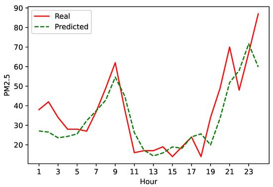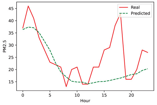 Next, we visually analyze the results of the 1 h spatio-temporal prediction of the LSTM-4 neural network considering the Cerro Navia station. Figure 6 shows the forecast for 24 h ahead—9 August 2013. We chose this day because it corresponds to a winter one, which is a season where greater pollution changes occur. In particular, we note that the network was able to predict the peak of PM that usually occurs around 9 am ([8]) due to the high traffic. In general, we note that the network managed to reasonably predict pollution, especially during the hours when the people are most exposed (i.e., from 7 am to 9 pm).