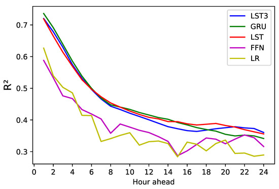 When comparing the results of predictions both 1 h ahead and 24 h ahead, it is evident that the results were much better for 1 hour ahead for all tested models. We believe there are two main reasons for this difference in performance. Firstly, when predicting 24 h simultaneously, the neural network generates a weight configuration that tries to respond to all the hours of the output variables simultaneously. In other words, learning seeks to adjust many outputs simultaneously, which may mean that performance must be reduced in one output variable to improve another. The second reason is that the prediction at a longer temporal distance is naturally more uncertain. This can be seen in Figure 7, where as the hour to be predicted moves further away from the input hours, the performance drops noticeably. The R is greater than 0.7 in the first hour, and ends up less than 0.4 at hour 24. A possible solution is to make predictions for every hour in order to maximize the use of the neural network; however, this can be expensive. Another way would be to explore new neural architectures that better handle adaptation to different output variables.