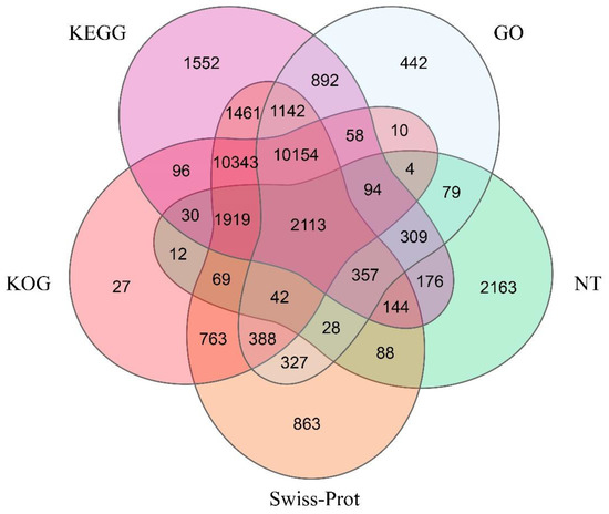 In summary, there were only 7627 unigenes (12.73%) annotated to the NT database. Meanwhile, 38,006 were annotated to at least one of the five protein databases (NR, Swiss-Prot, KEGG, KOG, GO) (Table 1). Specifically, 2113 unigenes were annotated with the five protein databases that were searched in the present study (Figure 1).