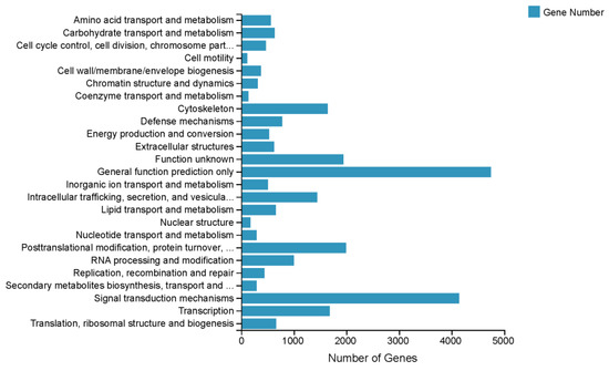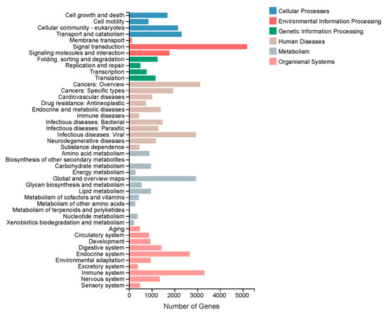 A total of 30,840 unigenes were annotated to different pathways based on the KEGG pathway analysis; the top two pathways were ‘Human Diseases’ (15,982 unigenes) and ‘Organismal Systems’ (12,845 unigenes). The predominant pathway subcategories were ‘Signal Transduction’ (5188), ‘Immune System’ (3313) and ‘Cancers: Overview’ (3120) (Figure 2). In total, 16,439 unigenes were assigned to three GO categories. As Figure S2 show, the dominant terms were ‘binding’ (8261 unigenes), ‘catalytic activity’ (6036 unigenes) and ‘membrane part’ (4878 unigenes). In addition, 26,122 unigenes were assigned to the KOG. These unigenes were classified into 25 subcategories (Figure 3).