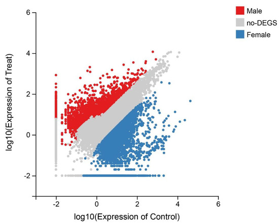 To detect the potential genes and pathways related to sex, comparative analyses were performed to identify differentially expressed unigenes between genders. In the present study, unigenes with |log2 Fold Change| ≥ 2 and p-value ≤ 0.001 were determined to be differentially expressed genes. After filtering, 22,507 DEGs were identified between the sexes, 10,419 of which were female-biased DEGs, while 12,088 were male-biased DEGs (Figure 4 and Figure S3). Many well-known sex-related genes were detected. For instance, zona pellucida sperm-binding protein genes (zps), StAR-related lipid transfer protein genes (start), spermatogenesis-associated protein genes (spatas), doublesex- and mab-3-related transcription factor (dmtr), P43 5S RNA-binding protein-like (42sp43), follicle stimulating hormone receptor (fshr) and forkhead box protein L2 (foxl2) (Table 2).