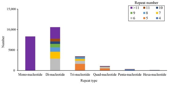 We identified 23,941 SSRs, of which 10,592 44.24% were di-nucleotide repeats, followed by mononucleotide (8320 SSRs, 34.75%) and trinucleotide (3458 SSRs, 14.44%), and other types SSRs (6.57%). Among these loci, SSRs with six tandem repeats were the most dominant (Figure 6). Furthermore, we gave the primers and other information of these SSR loci.