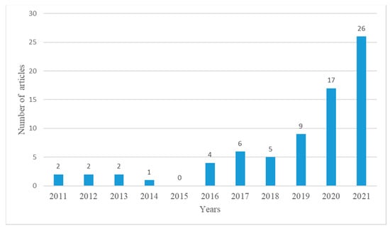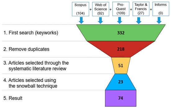 The snowballing technique was used to expand the results. In other words, the articles obtained from the search strings in Table 2 were examined for new relevant references (i.e., articles), and those meeting the inclusion criteria were added to the list of selected publications [59]. The resulting number of articles is shown in Figure 3.