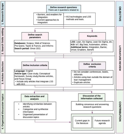Other aspects of the integration that have received little or moderate attention in the literature include the contact points between I4.0 and LSS [16], reference architectures to enable integration [50], and the combined impact of I4.0, LSS, and Quality Management Systems (e.g., ISO 9001) on organisational performance [51]. Furthermore, in a review in [13], themes such as motivations, challenges, benefits, and critical success factors were identified as recurrent in the literature on I4.0 and LSS integration. However, in most cases, these themes have been addressed only from the I4.0 and L integration perspective or have appeared in the I4.0 and LSS integration literature as ancillary topics (as opposed to core topics), implying a need for a systematic review of them. To the best of our knowledge, only the benefits of integration have been addressed in recent work by [10]. Encouraged by this research gap, we propose a research design to systematically assess the literature on enablers of and barriers to I4.0 and LSS integration in the next section.