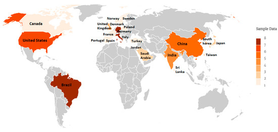 In total, academic contributions from 22 countries were identified, as shown in Figure 4. The findings show that studies on I4.0 and LSS integration have mainly been carried out in Germany, Brazil, Italy (eight articles each), the United States (six articles), and China (five articles). In the case of Oceania, an analysis in [60] found that, from 2017 onwards, I4.0 has started to gain attention in companies; however, no journal article has addressed its integration with LSS in the industries of this continent so far, as shown in Figure 4.