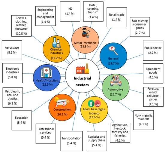 Additionally, the industries concentrating most of the research on I4.0 and LSS were identified. As shown in Figure 5, metal mechanical (33.8%) and automotive (25.7%) are the two most addressed sectors, followed by food and beverage (17.6%) and construction (16.2%). The automotive sector is familiar with Lean manufacturing because of its origins with the Toyota car manufacturer [61], which places it in a favourable position to become a primary research source for I4.0 and LSS integration. Other sectors are grasping the importance of this integration in their organisations. One example is the healthcare sector, where integrating I4.0 and LSS may help improve patient flow and enhance supply chain performance, especially in high-demand scenarios [62]. Twenty-four industrial sectors were identified, with some papers addressing more than one (hence, percentages in Figure 5 do not add up to one). Nevertheless, 29.7% of the research did not mention the sector in their study.
