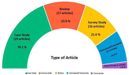 Another aspect of interest is the type of research conducted in the reviewed papers. Case studies accounted for 39.2% of the research. For example, in [63], JIT and robotics in the automotive industry were analysed to optimise the cycle time in a hybrid (human–robot) assembly line system. It was found that 23.0% of the authors used the review method to address the interaction between I4.0 and LSS. Some studies assessed integration feasibility through surveys (21.6%) with the application of structural equation methods [35,40] and correlation and regression analyses [62,64]. Finally, 16.2% used conceptual frameworks and focus groups, as shown in Figure 6.