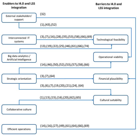 This section discusses various ways to deal with I4.0 and LSS integration challenges. Based on the method introduced in [96], the approaches result from linking the enablers identified in Section 4.2 of this study to their corresponding barriers in Section 4.3, as shown in Figure 7. Following the convention adopted in [97], the arrows in the figure show which enabler categories have an advantageous effect on which barrier categories and the numbers on the lines correspond to the numerical identifier of each paper in Appendix A, directly or indirectly supporting such connections.