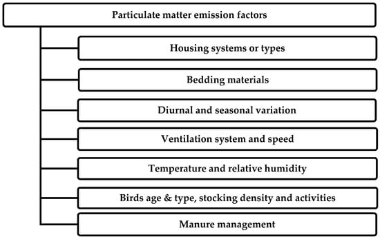 Dust emissions from poultry farms are affected by various factors and changes according to variable climatic conditions, applied management practices, the number of birds, and housing types. Various researchers have explained many factors that cause PM emission, as shown in Figure 2 [,,,,,].