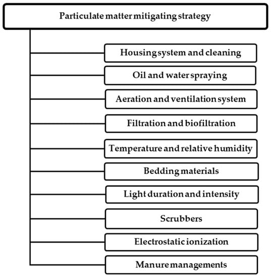 The PM concentration in poultry housing is primarily affected by housing and feeding, animal species, stocking density, lighting duration, environment conditions (season), and existing mitigation practices [,,,]. It is important to possess a deep knowledge of PM morphology to evaluate their effects and propose the best mitigating technologies in animal housing. Particulate matter mitigating strategies can be classified into three different groups: dilution and effective room air distribution, source-control techniques to reduce PM from the source, and PM removal or cleaning techniques by using acid scrubbers, electrostatic precipitators, or ionizers []. Other techniques for improving air quality are oil spraying, manure handling, and electrolyzed water spray []. Controlling the living space environment, including temperature, humidity, air quality, and litter quality, is critical for poultry well-being []. Variations in indoor air quality have been linked to various factors, including barn architecture, manure management, animal densities, feed regimens, building ventilation, and farm management practices. Therefore, various biochemical, chemical, managerial, physical, and physiological practices must be implemented to decrease PM significantly lower than recommended guidelines (Figure 3).