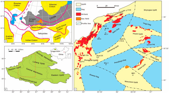The Junggar Basin is one of the most essential hydrocarbon-bearing basins in northwestern China, with an area of 13.6 × 104 km2 [8]. The Junggar Basin is located in the west of the Junggar–Tuha Plate and connects with the Western Junggar Orogenic Belt, as shown in Figure 1 [9,10]. Many oil and a few gas fields have been discovered through some decades of hydrocarbon exploration (Figure 1). Much progress has been made and commercial shale oil flow has been recently obtained from the Permian rock units. Therefore, the Junggar Basin has become a hot topic of petroleum exploration in China [11].