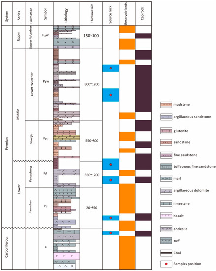 The basement of the Junggar Basin is of the Carboniferous age. The sedimentary fill of this basin comprises sedimentary units ranging in age from the Permian to the Quaternary [12], as shown in Figure 2. The Carboniferous stratigraphy of the Junggar Basin mainly deposits volcanic rocks and shallow marine clastic rocks [13]. In the Early and Middle Permian, the Junggar Basin developed several depositional and subsidence centers, mainly fan-deltaic and lacustrine sediments [14], which are the most critical source rocks [15]. From Late Permian to Triassic, the Junggar Basin underwent a high subsidence phase. The Late Permian basins have a reduced distribution and a limited distribution of hydrocarbon source rocks. The Triassic basin is more extensive than the Upper Permian, and a basin-covering layer system developed. During Jurassic times, a set of continental coal-bearing deposited and associated shallow water sediments were deposited.