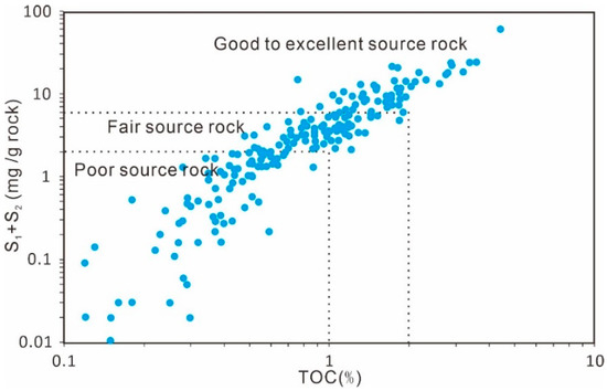 Organic matter abundance is one of the main indexes to determine the hydrocarbon generation potential. At present, the commonly used organic matter abundance indexes mainly include total organic carbon content (TOC), chloroform asphalt “A”, and total hydrocarbon content (HC), as well as rock pyrolysis hydrocarbon generation parameters S1 (free hydrocarbon) and S2 (pyrolysis hydrocarbon), among which organic carbon content (TOC) and rock pyrolysis hydrocarbon generation parameters are commonly used [16].