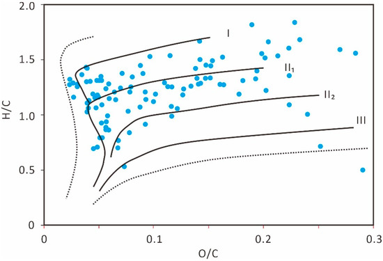The kerogen elemental diagram is the standard method to determine the type of organic matter. The H/C of kerogen in the Fengcheng Formation source rock is as high as 1.8, as shown in Figure 4. The main types of kerogen are type I and type II1, and the proportion of type II1 organic matter is relatively high, mainly humic organic matter. At the present phase of the hydrocarbon exploration no exploratory well has been drilled to the center of hydrocarbon producing sag. The source rock samples are mainly distributed in the slope area with shallow water bodies.