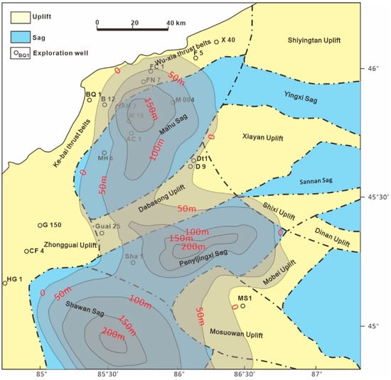 The distribution of the Permian source rocks in the western part of the basin is described, as shown in Figure 5. The source rocks of the Permian Fengcheng Formation are widely distributed in the three sags of the basin’s western region, with a thickness more than 100 m.