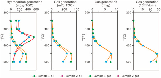 The oil and gas production rate at different evolutionary stages of each sample was obtained by conducting a hydrocarbon generation simulation experiment. Dai Jinxing et al. ([24] made statistics on the gas generation intensity of the large and medium-sized gas fields discovered in China, and found that the gas generation intensity was all greater than 20 × 108 m3/km2. The latter authors concluded that the gas generation intensity greater than 20 × 108 m3/km2 was one of essential conditions for forming large and medium-sized gas fields [24]. The values of the gas generation intensity of the Fengcheng Formation source rocks reaches 20 × 108 m3/km2 at 425 °C (Figure 6), meaning that the gas generation intensity of the Fengcheng Formation source rocks could reach the essential condition of large and medium-sized gas fields at 425 °C. The gas generation intensity calculation was based on the rock density of 2.5 g/cm3 and the average source rock thickness of 150 m.