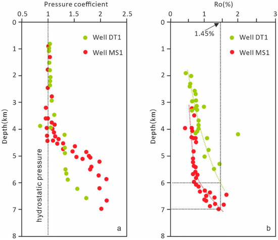 According to the statistics of the pressure coefficient variation with depth in the western part of the basin, it is evident that the pressure coefficient at 4000 m is more than 1.2, indicating abnormal high pressure (Figure 7a). There are apparent differences in the degree of abnormal development in different regions. The pressure coefficient of the Well MS 1 is higher, with a pressure coefficient of more than 2, which is close to the rock breakdown pressure, and may be the maximum pressure that could be developed. The degree of abnormal pressure development in the Well DT 1 is relatively lower, with a pressure coefficient distributed in the range of 1.2~1.35. Considering that most of the pressure coefficients deeper than 4000 m are above 1.2, it could be assumed that the pressure development of Well DT 1 is the lowest in the study area.