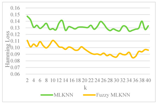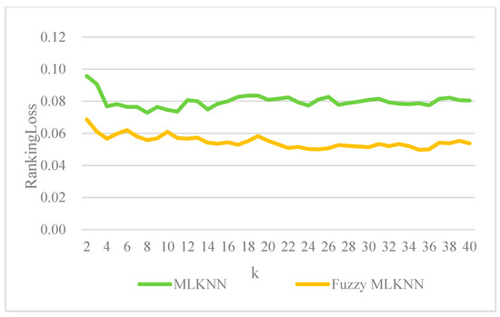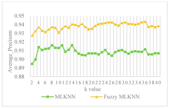 The experimental environment in this research is MATLAB (R2019b). There are two parameters involved in the experiment. One is the selection of the K value; the other is the setting of smoothing parameters. Regarding the choice of K value, generally speaking, if the K value is too small, it is easily affected by abnormal points. The model is easy to overfit, while if the K value is too large, it is more likely to suffer from problems caused by unbalanced samples, resulting in under-fitting; such results can be seen in the work of [49]. Therefore, in this paper, K is changed from 2 to 40, and the traditional MLKNN algorithm and the improved MLKNN algorithm are compared. A total of 80 experiments are carried out to obtain the performance change effect chart, to determine the optimal K value under the two algorithms, and to compare the results. Regarding the smoothing parameter, we are consistent with the existing literature and are set to the default value of 1.