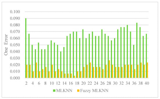 Since Rankingloss and OneError are considered indicators based on the order of labels and are in the same order of magnitude, the smaller the two indicators are, the better the performance is. This paper considers these two indicators at the same time. In Figure 3, the blue line is the RankingLoss with MLKNN, and in Figure 4, the green columnar presents OneError values with MLKNN. Respectively, the red line in Figure 3 and the orange columnar in Figure 4 are the RankingLoss and OneError values of Fuzzy MLKNN.