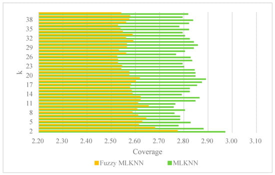Figure 5 shows the performance of Coverage under different K values. Coverage is the step size required to traverse the correct label. The smaller the index, the better the performance. From the figure, we can see that the Coverage of the improved algorithm is also significantly lower than that of the traditional algorithm. The mean value of the improved algorithm on Coverage is 2.585, and the traditional algorithm is 2.822. The minimum Coverage values of the improved algorithm can be obtained at 24~26, 36, while the minimum Coverage values of the traditional algorithm are obtained at 10, 11, and 14.