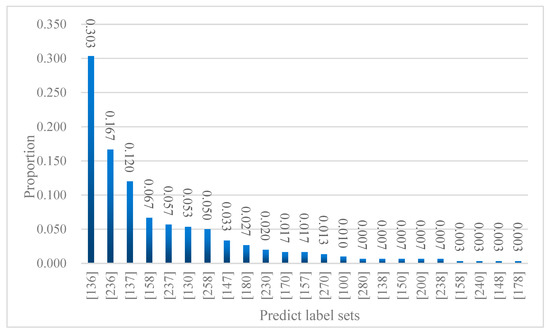 To make a portrait of users, we need to describe the distribution characteristics of labels. Referring to [50,51], we choose the best parameter with Fuzzy MLKNN, K = 36, and then conduct the algorithm with the whole dataset. The results are shown in Table 6 and Figure 6. Table 6 summarizes the proportion of one label, and Figure 6 describes user labels.
