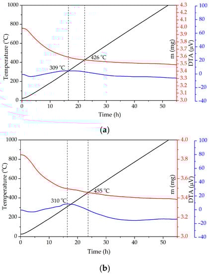 According to the TGA curve in Figure 3a, natural zeolite has two stages of composition. The first stage (from 20 °C to 426 °C) is for moisture and physically adsorbed water, with the water residing in the zeolite cavities and bound to the extra-framework-cation loss. The second stage (from 426 °C to 1000 °C) is for hydroxyl groups, and isolated OH groups (structural water) were eliminated [42]. After the modification, the region of the first stage of combustion (from 20 °C to 426 °C) changed (from 20 °C to 455 °C), while we detected no significant difference in the exothermic peak (from 309 °C to 310 °C) in Figure 3b.