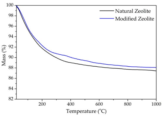 We compare the TGA curves of the natural and modified zeolites in Figure 4. The percentages of the masses of the solid particles after the complete combustion of the natural and modified zeolites were 87.43% and 88.1%, respectively (mass losses of 12.57% and 11.9%, respectively).