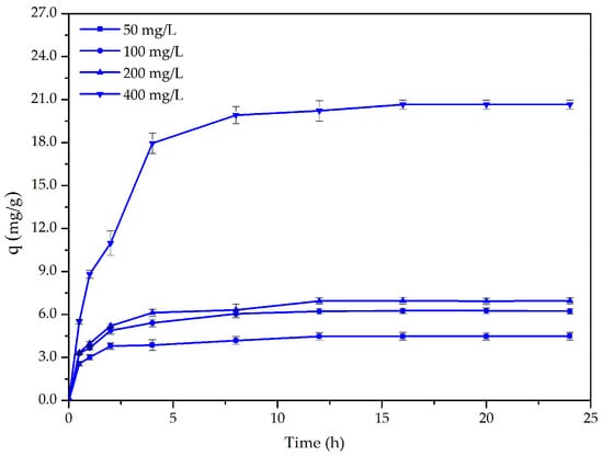 The increase in the adsorption capacity was rapid in the first 30 min, slowed during the next 8 h, and then became constant. The maximum adsorption capacity increased from 4.50 to 20.66 mg/g when the initial concentration of the Cu(II) increased from 50 to 400 mg/L. A higher value of the initial concentration gradient provided a significant driving force in the adsorption process and thus increased the adsorption capacity.
