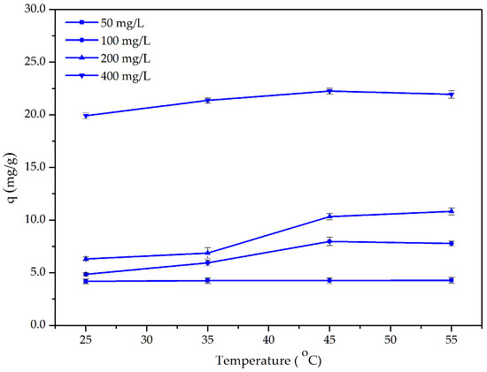 As shown in Figure 7, the adsorption capacity was increased with an increase in temperature from 25 °C to 45 °C, which is further evidence of an endothermic reaction. When the temperature increased from 45 °C to 55 °C, the adsorption capacity decreased slightly in some cases.