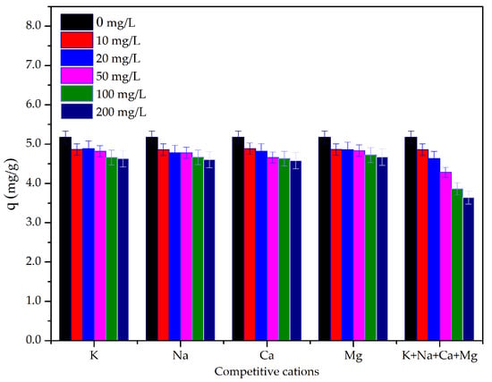 We observed no significant decrease in the adsorption capacity when the concentrations of competitive cations were lower than 100 mg/L. The adsorption capacity was decreased by 1.3 mg/g (20%) for the combination of all four cations with concentrations of 100 and 200 mg/L.
