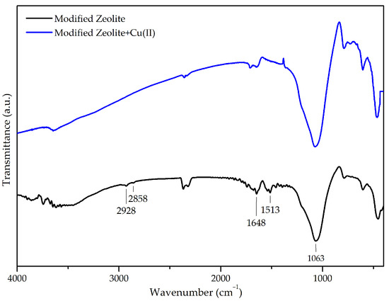 We found the FT-IR spectra of the modified-zeolite peaks in Figure 9 at 3646 cm−1 (Si-OH), 3463 cm−1 (OH) [38], and 1648 cm−1 (for water molecules associated with the cations) [50]. We detected peaks for Si–O and Al–O bonds at 1052 cm−1 and peaks for Si–O–Si and Al–O–Al bonds at 459 and 796 cm−1, respectively. Moreover, we found peaks with low intensity at 2928 and 2858 cm−1 (asymmetric and symmetric stretches of the CH bonds) [51], which indicated the presence of the propyl chains of APTES. The peaks appearing at around 1500 and 1600 cm−1 belong to the NH2 scissor vibrations, which indicated the presence of the NH2 functional group of APTES [52]. These peaks correspond to the Si(CH2)3NH2, which we detected with low intensity due to the low-concentration solution of APTES that we used for obtaining the adsorbent. After the Cu(II) adsorption, we detected the following changes in the FT-IR spectra: The peaks at 2928 cm−1, 2858 cm−1, and 1513 cm−1 that we recorded before the adsorption disappeared. The intensities of the peaks around 3400–3600 cm−1 and at 1648 cm−1 decreased, while the peak at 1063 cm−1 (Si–O–Si) shifted to 1073 cm−1. The Cu(II) interacted with a functional group of C, N, and O atoms, and the Si–O–Si-bond spectrum shifted due to the formation of metallic organic compounds.