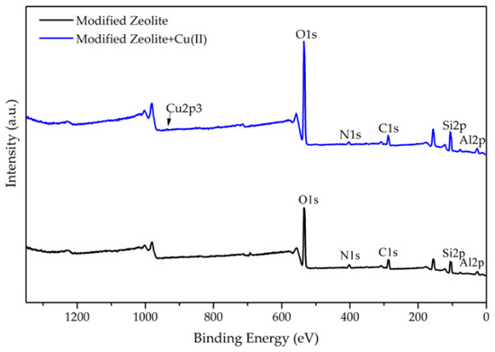 X-ray photoelectron spectroscopy (XPS) spectra of modified zeolite before and after the adsorption of Cu(II).