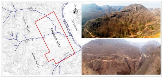The project was located in the loess hilly and gully area in northern Shaanxi. The original terrain of the site is undulating, having the shape of three ridges with two ditches. The maximum relative elevation difference is about 190.0 m, and scarps with heights of 20.0–40.0 m are distributed in local sections of the site. The landform of the site is shown in Figure 1. The original stratum of the site is mainly loess, and the bedrock at the bottom and side walls of the local gullies is exposed. There is seasonal flow in the original gully, which is the main discharge channel of groundwater and surface water.
