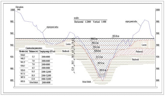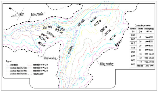 The filling body was divided into eight layers and filled by dynamic compaction. The first layer was a gravel blind ditch, and the tamping energy was 8000 kN.m. The filling material above the blind ditch was loess, and the maximum thickness of the filling was about 60 m. The filling construction was divided into seven layers, and the tamping energy was 4000~12,000 kN.m. The plan for layered dynamic compaction filling is shown in Figure 2, and the typical section of the filling body is shown in Figure 3, while the basic physical properties of each layer of filling are shown in Table 2.