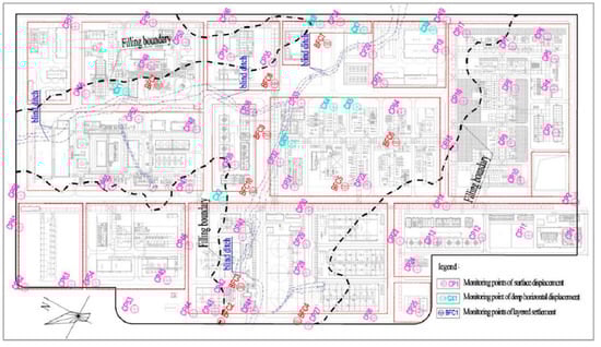 In order to study the deformation characteristics of the loess-filled foundation, 64 surface displacement monitoring points were arranged in this study, including 25 in the fill area and 39 in the excavation area. The layout plan of the monitoring points is shown in Figure 4. The monitoring point is the observation pier with a forced centering device, and the specification of the mark stone was 120 cm × 20 cm × 20 cm. The vertical displacement datum network was arranged in the form of a node network. The datum points were buried in the undisturbed soil layer outside the construction area. The surface vertical displacement monitoring points formed a closed or attached line with the nearby vertical displacement datum points. A Tianbao DiNi digital level was used for observation. Deformation monitoring started on 15 April 2018 and ended on 15 April 2020, with a total of 731 days in 40 phases.