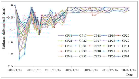 In order to study the settlement deformation characteristics of the fill foundation, the monitoring results of 25 settlement deformation monitoring points located in the fill area were used. The basic information of each monitoring point and their final monitoring results are shown in Table 3 and Figure 5, Figure 6 and Figure 7, respectively.