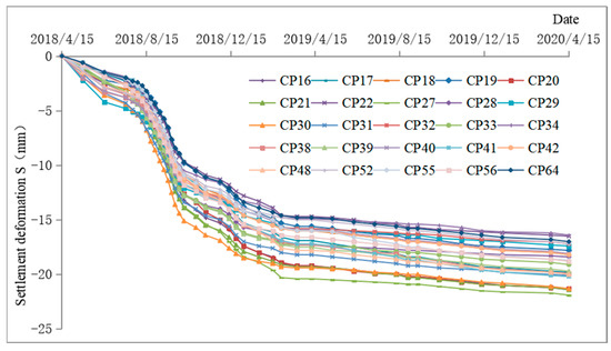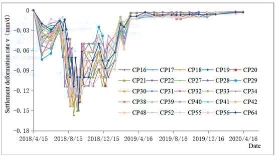 It can be seen from Figure 6 and Figure 7 that the characteristics of the cumulative settlement deformation time history curve of each monitoring point were basically similar, and the settlement deformation rate also showed an obvious trend, that being that the settlement deformation had the basic characteristics of slow growth in the early stage, rapid growth in the middle stage, and basically being stable at a fixed value in the later stage. It reflects the characteristics of foundation settlement with the addition of additional load.