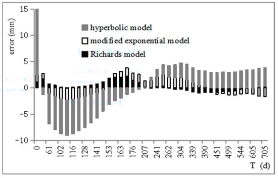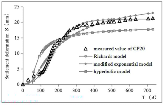 The Richards model, modified exponential model, and hyperbolic model were used to predict the settlement of the typical monitoring point CP20 in this study, and the predicted value was compared with the measured value. The comparison results are shown in Table 5 and Figure 11 and Figure 12. The parameters involved in each prediction model in the calculation were determined by regression analysis based on the monitoring data.
