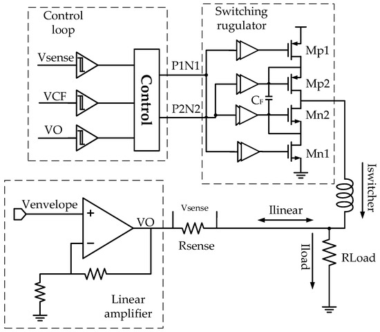- Paek, J.-S.; Youn, Y.-S.; Choi, J.-H.; Kim, D.; Jung, J.-H.; Choo, Y.; Lee, S.-J.; Lee, S.-C.; Cho, T.; Kang, I. An RF-PA supply modulator achieving 83% efficiency and −136 dBm/Hz noise for LTE-40 MHz and GSM 35 dBm applications. In Proceedings of the 2016 IEEE International Solid-State Circuits Conference (ISSCC), San Francisco, CA, USA, 31 January–4 February 2016; pp. 354–355. [Google Scholar]