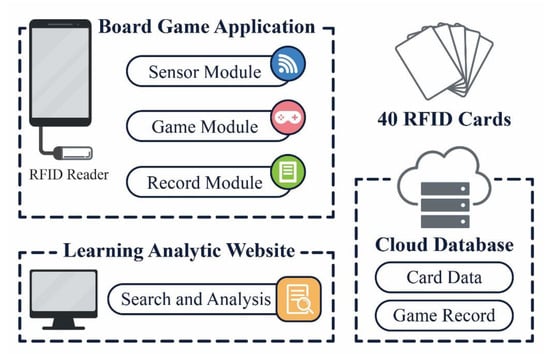 The technology-enhanced board game was applied in this study to support teachers in conducting prime factorization education in traditional learning environments. The board game is a card game developed using mobile and sensor technologies []. The architecture of the board game is shown in Figure 1. The board game system consists of 40 RFID cards, a board game application, a cloud database, and a learning analytic website.
