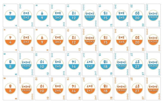 To play the board game, students firstly set a deck of 40 RFID cards on a table and prepare a mobile device with the board game application. Each card presents a composite number or a prime factor, as show in Figure 2. Each game is set to support 2 to 3 students to play together. After the cards are shuffled, each student is dealt 6 or 9 cards depending on whether 3 or 2 students are participating in the game. Moreover, 4 cards are turned over face up from the remaining deck and placed in the layout, as shown in Figure 3. During the game process, students have to review and apply prime factorization concepts to capture a card from the layout by using individual hand cards. The capture rule is to require students to determine whether the cards turned over on the table are the same as the cards in the hand, or whether the cards turned over on the table and the cards in the hand are a composite number and a prime factor. If a capture is successful, the student wins the captured card and scores. If a student’s individual hand cards cannot capture any card from the layout, the student cannot score and has to leave an individual hand card as a new layout card. Whether or not a student successfully captures a card from the layout, it is then the next player’s turn.